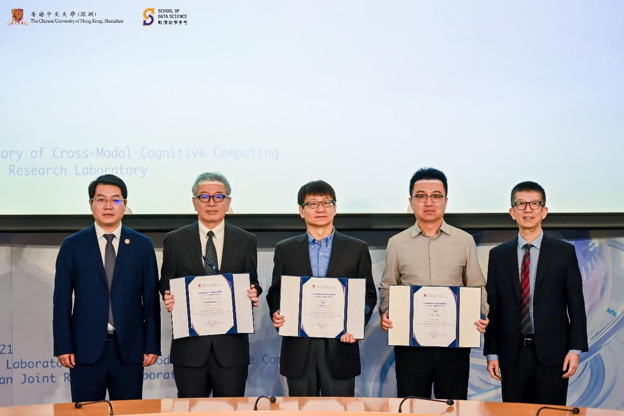 香港中文大学(深圳)协理副校长(行政)卢国师(左一)及趣丸科技总裁杜国(右一)为武执政教授(右二)、张顺四副总裁(左二)和李海洲教授(左三)颁发港中大(深圳)-趣丸科技联合实验室主任、联合主任及管理委员会主任聘书。