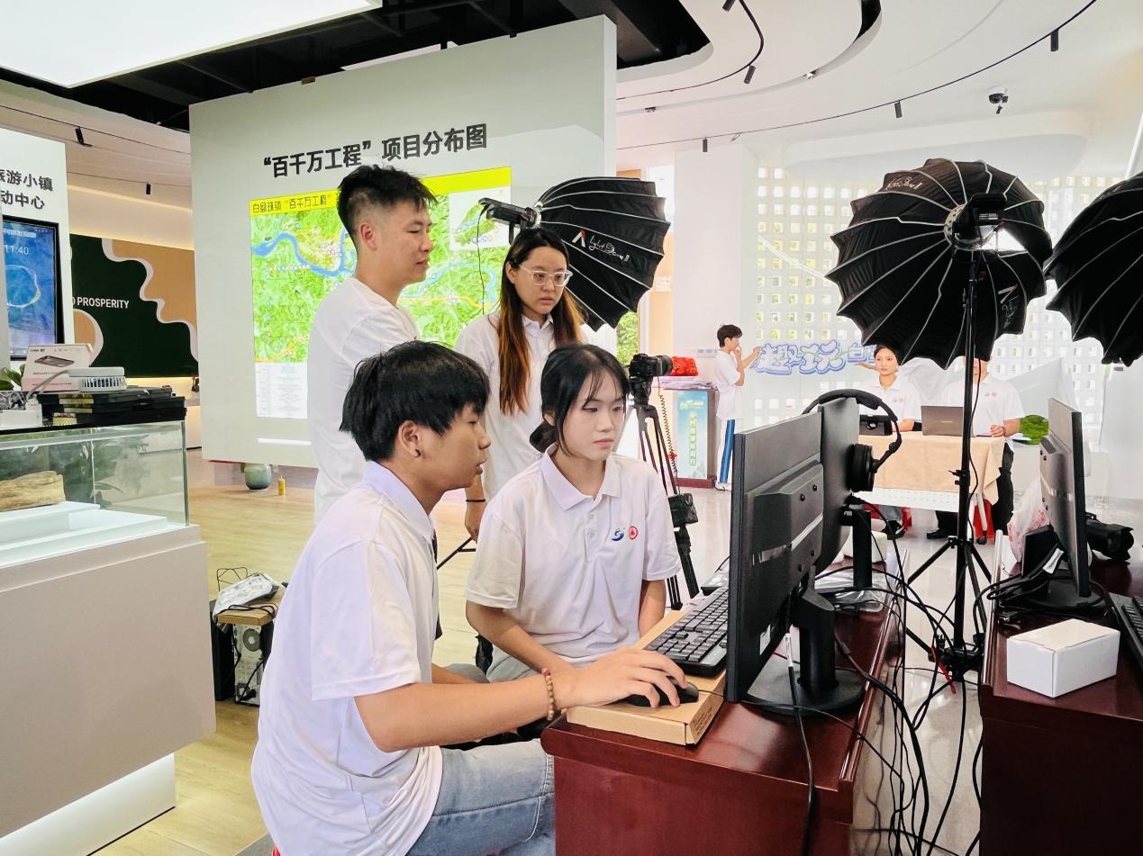 “‘趣’玩白盆珠,点赞深职大!”直播间里传来一阵阵呐喊声,这是“红金蓝绿”农文旅直播突击队正在直播的瞬间。这支突击队通过前期对白盆珠镇文旅资源的挖掘分析以及实地走访,以大学生视角选取了有代表性、符合年轻人文旅偏好的特色景点及线路,充分结合影视传媒的专业特长,直播间累计观看量6300余人次,点赞量7w+。