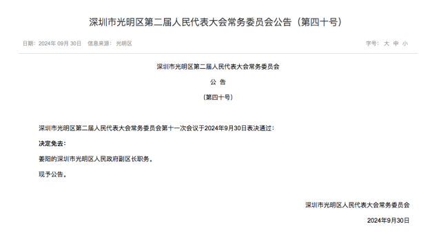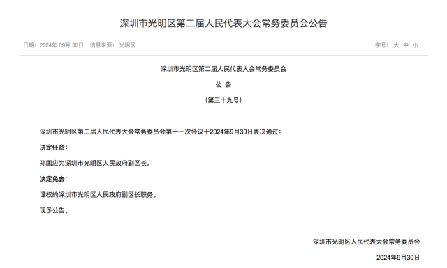 记者从光明区政府在线网站获悉,9月30日,光明区二届人大常委会第十一次会议召开。会议表决决定任命孙国应为深圳市光明区人民政府副区长;决定免去谭权的深圳市光明区人民政府副区长职务,免去姜阳的深圳市光明区人民政府副区长职务。