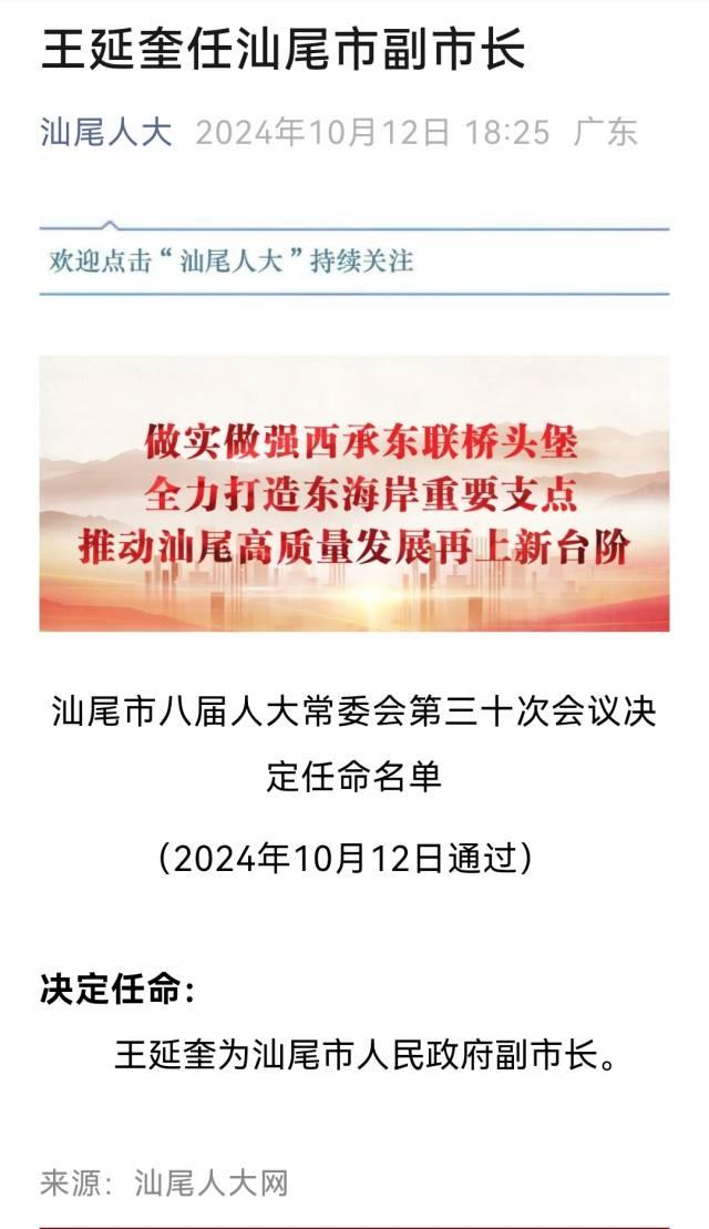 10月12日,汕尾人大发布信息,王延奎任汕尾市副市长。