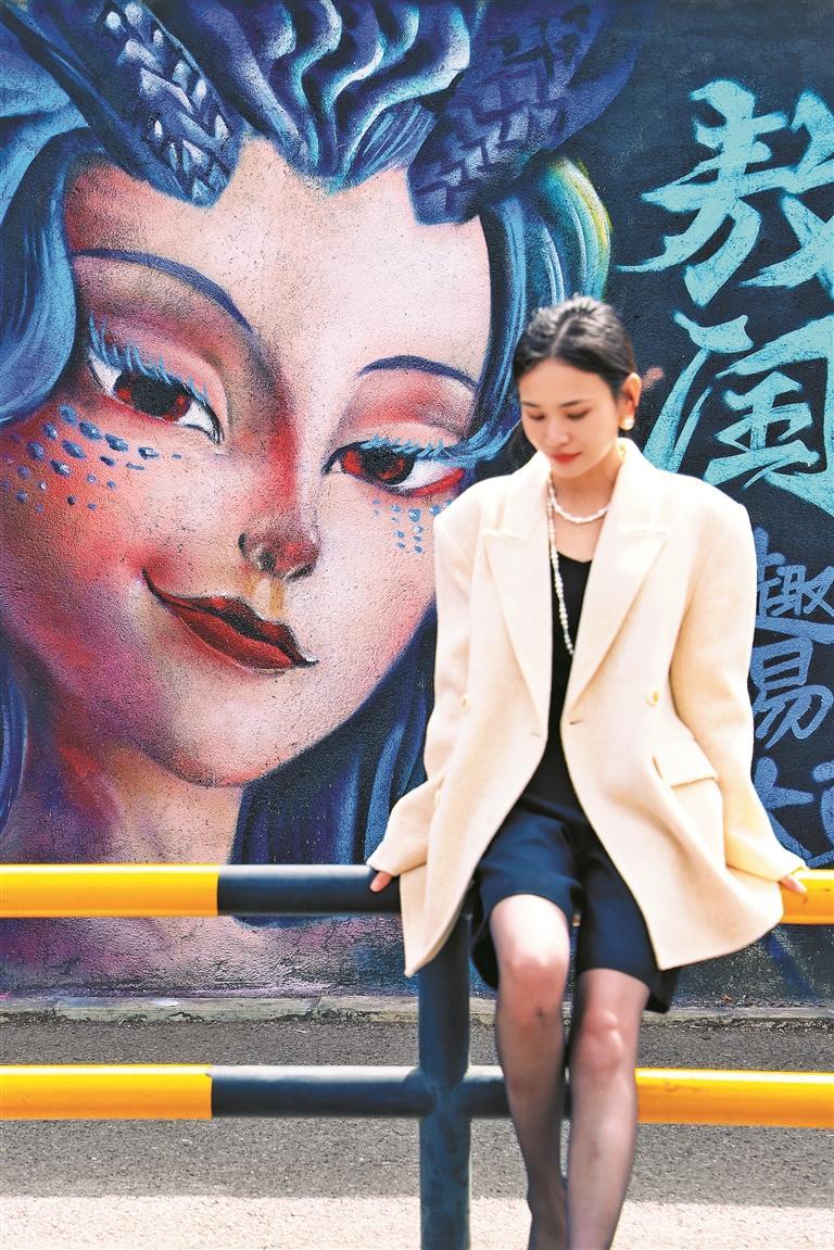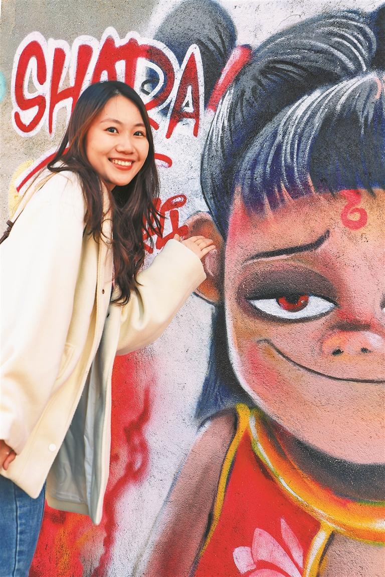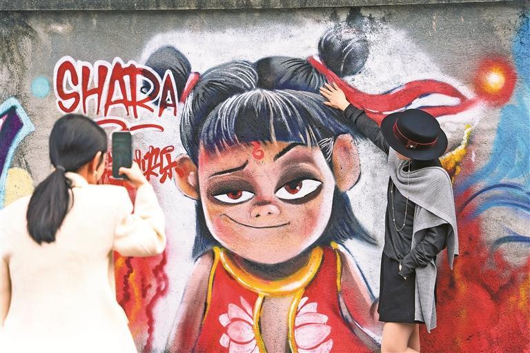 “00后”姑娘彭丹(左一)和朋友一起绘制的哪吒涂鸦墙吸引大批市民游客前来拍照打卡。受访单位供图