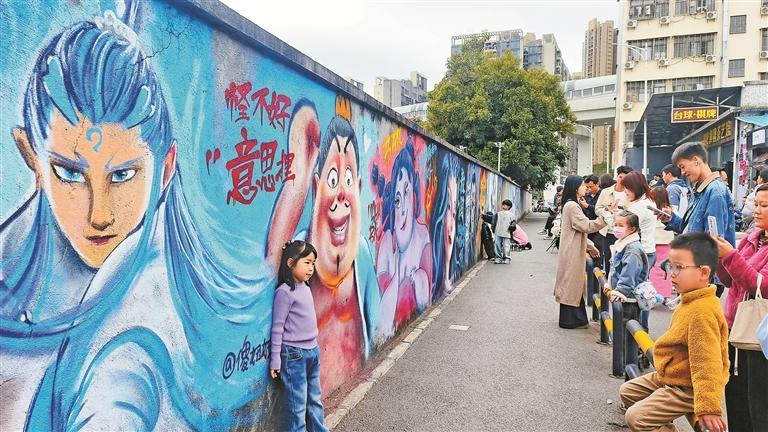 “本来是准备画两三个就结束了,没想到受到了很多人的喜爱,成了网红打卡地,有点意料之外,不少网友还在评论区回复要继续看更多的角色。”看着哪吒主题涂鸦墙如此受欢迎,彭丹她们立即决定,在这面墙上继续创作。很快,石矶娘娘、敖闰、申公豹、申小豹等画作一一呈现在大家眼前,单调的墙面仿佛“活”了起来,居民被深深吸引,纷纷前来围观拍照。相关视频在网络发布后,更是吸引了不少市民前来打卡。