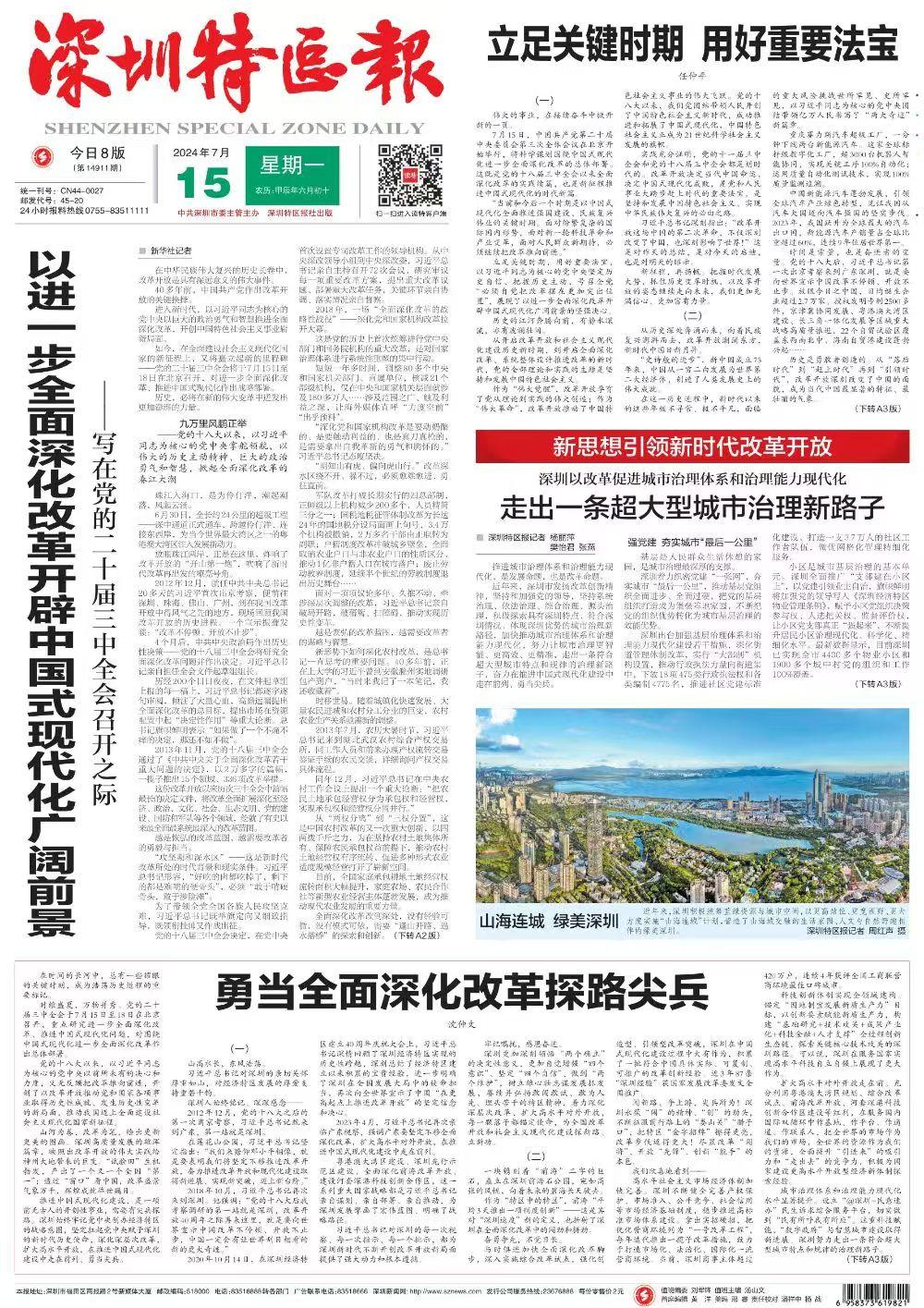 党的二十届三中全会宣传报道声势浩大。会前开设“习近平总书记引领新时代改革开放伟大实践 深圳全面深化改革一线观察”栏目。全会召开当天推出沈仲文重磅文章《勇当全面深化改革探路尖兵》。会后,连续在重要版面刊发评论员文章和 11 篇“学习贯彻党的二十届三中全会精神”系列评论,策划推出“学习贯彻党的二十届三中全会精神·一把手访谈”专栏,全面多维立体展现深圳学习贯彻党的二十届三中全会精神的浓厚氛围。