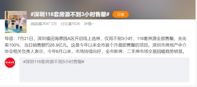 图13:“深圳116套房源不到3小时告罄”相关话题在全网阅读量超2600万。