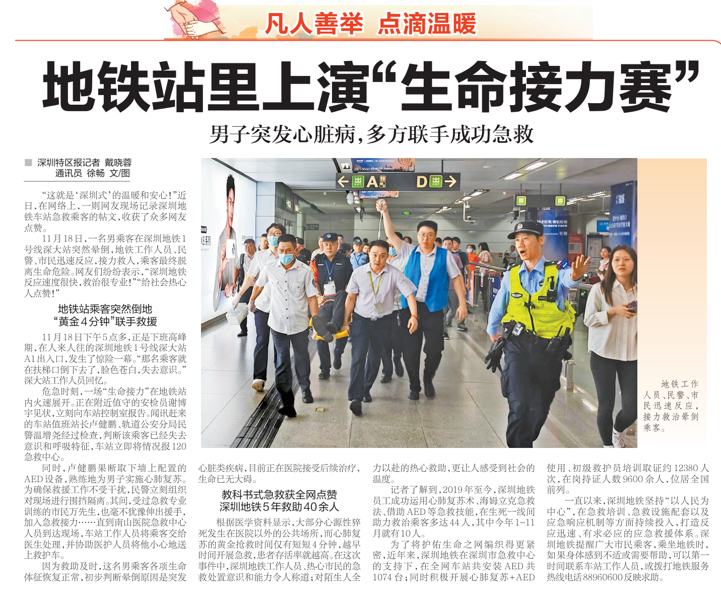 坚持把关爱生命放在重要位置,积极传递真善美,树立正面典型,激发人们向上向善的力量。刊发《地铁站里上演“生命接力赛” 男子突发心脏病,多方联手成功急救》,彰显深圳地铁工作人员、民警、市民的专业迅速反应与暖心救助。