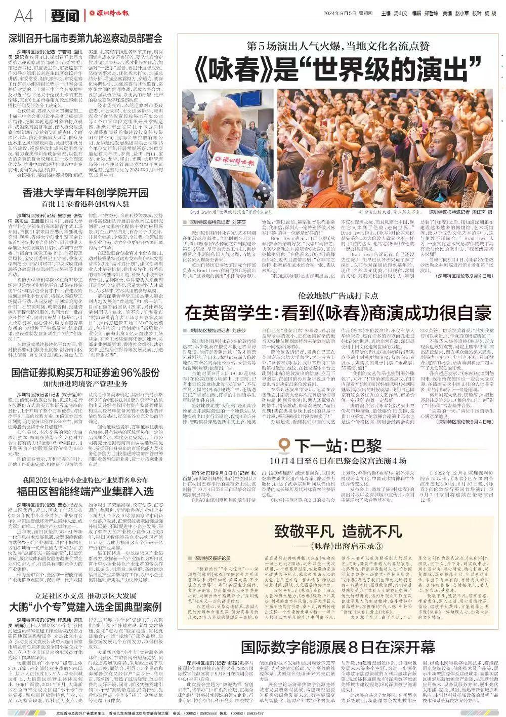 浓墨重彩做好深圳原创舞剧《咏春》海外演出报道,释放中华文化感染力。《咏春》在英国和巴黎演出期间,以“消息+评论+综述+短视频+推文+图片+海报”融媒组合拳,推出多篇优质报道,立体传播深圳本土原创舞剧,助推中国优秀传统文化出海,将“深圳故事”讲到海外。