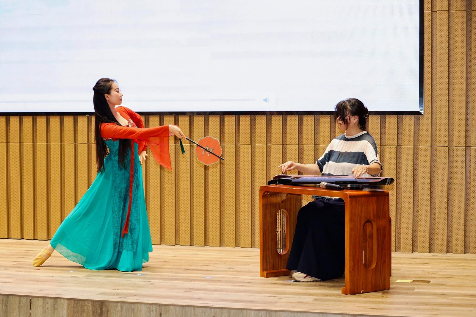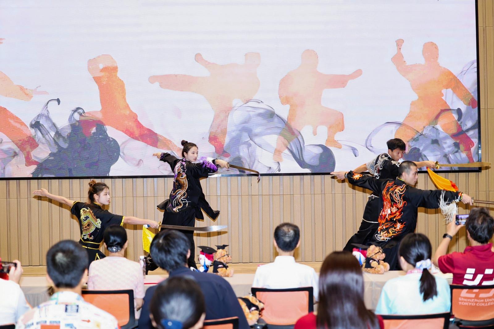开营仪式伊始,宣传片展现了深圳大学的浓厚学术氛围与青春活力风貌,暖场表演节目精彩迭出。深圳大学学生李峰玲、赖嘉慧带来古琴伴舞《关山月》,古典韵律与优美舞姿交融;深圳大学武术队带来气势磅礴的中国武术串烧,诠释中华武术的刚健气魄;印度尼西亚籍学生杨晶晶吉他弹唱《起风了》,用音乐传递青春共鸣。