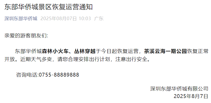 ● 盐田:8月7日,深圳东部华侨城发布景区恢复运营通知。详情>>