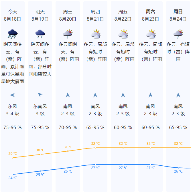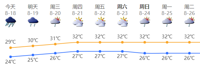 预计8月26日至9月14日天气炎热,台风影响风险高。8月底至9月中旬海上热带系统和季风活跃,可能有台风影响并伴有2次明显降水过程,大致出现8月底至9月初和9月中旬中期,降水量级可达大到暴雨或以上,并可能伴有雷暴和短时大风等强对流天气。