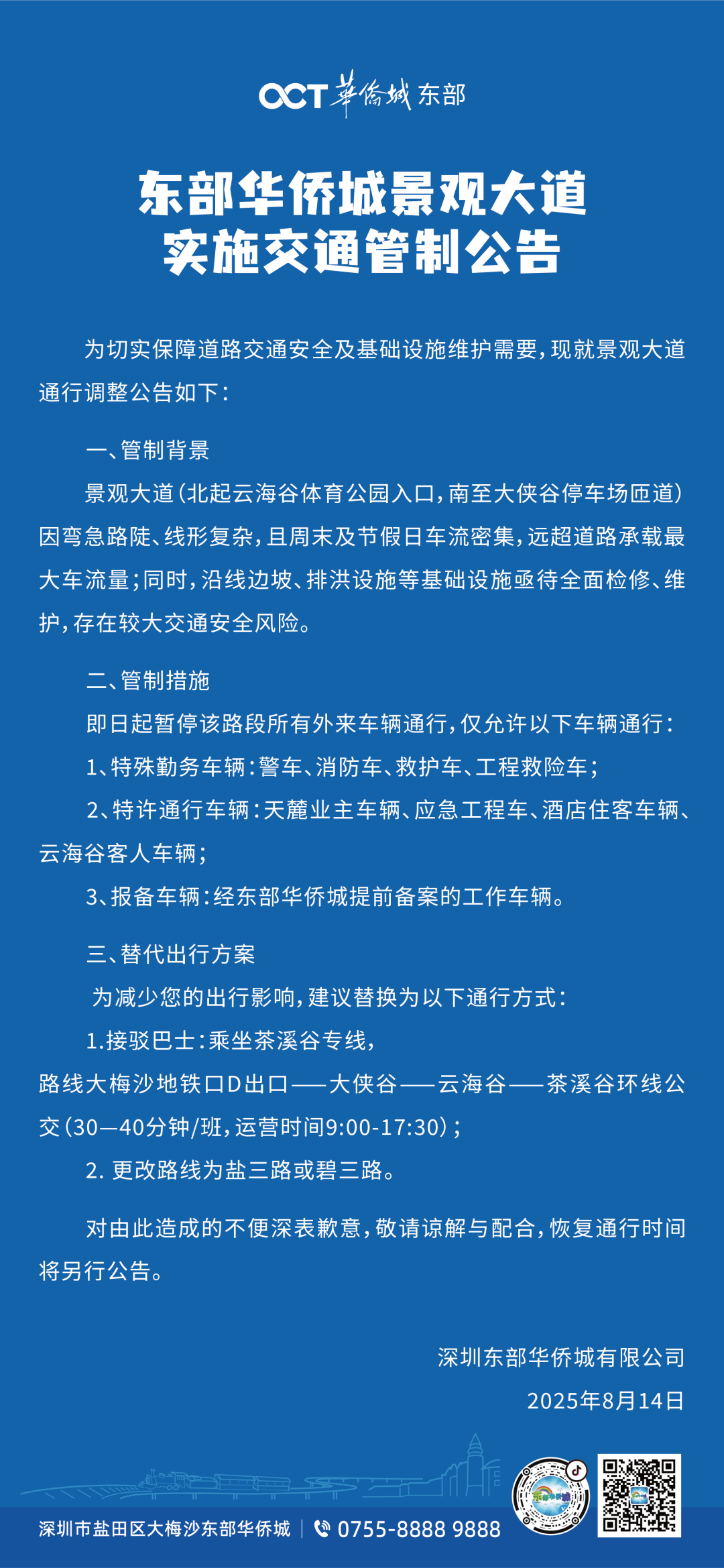 ● 深圳东部华侨城发布公告:东部华侨城景观大道(北起云海谷体育公园入口,南至大侠谷停车场匝道)暂停所有外来车辆通行。