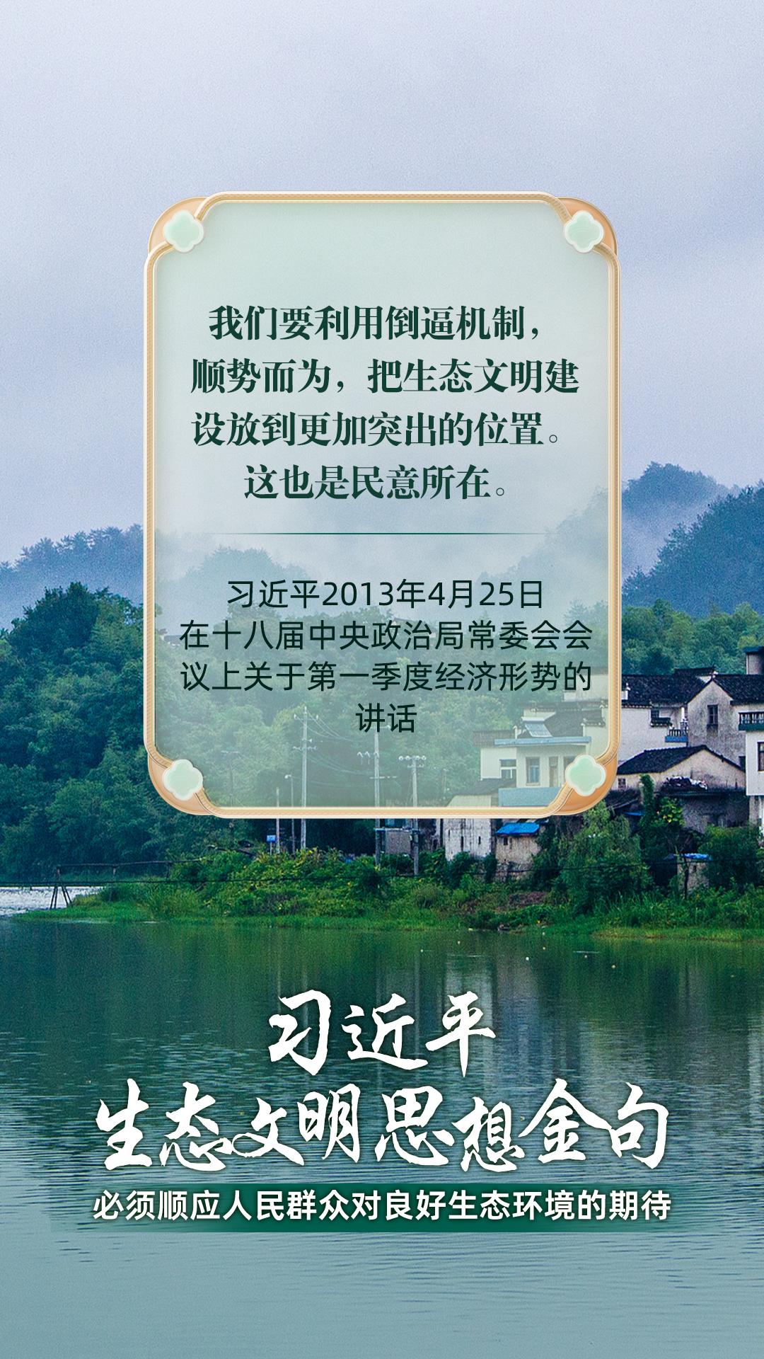 党的十八大以来,习近平总书记把生态文明建设摆在治国理政突出位置,大力推动生态文明理论创新、实践创新、制度创新,创造性提出一系列新理念新思想新战略,形成了习近平生态文明思想,对生态文明建设的时代之问、世界之问、人民之问作出科学解答。大象新闻《习近平生态文明思想金句》系列策划,今天推出《必须顺应人民群众对良好生态环境的期待》。