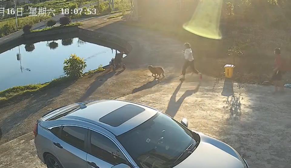 监控视频显示,8月16日18:07,一名穿白色上衣的女子推着婴儿车,与旁边穿红衣的女子闲聊过程中,婴儿车离手,随即顺着斜坡滑落。“哎哟”白衣女子发现后连连惊呼,随即快步去追,在婴儿车翻落进鱼塘前,她不仅未能抓住,反而自己也跌进鱼塘。