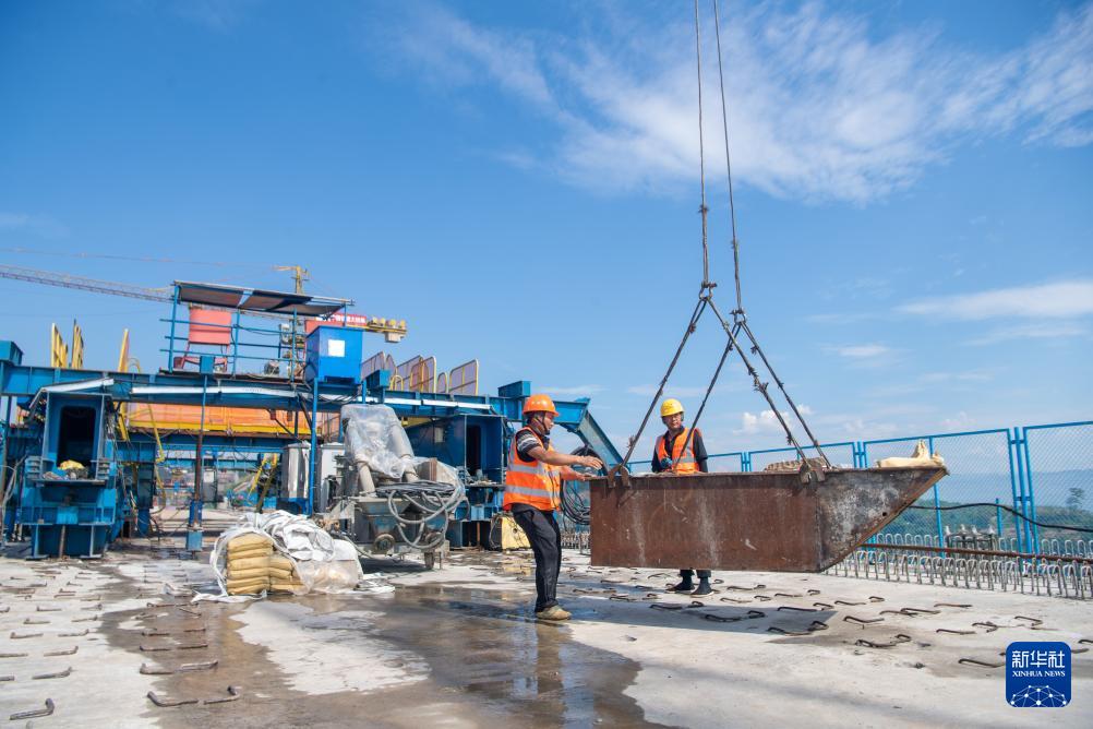 8月18日,工人在渝万高铁渠溪河双线大桥建设现场进行大桥合龙后的收尾作业。