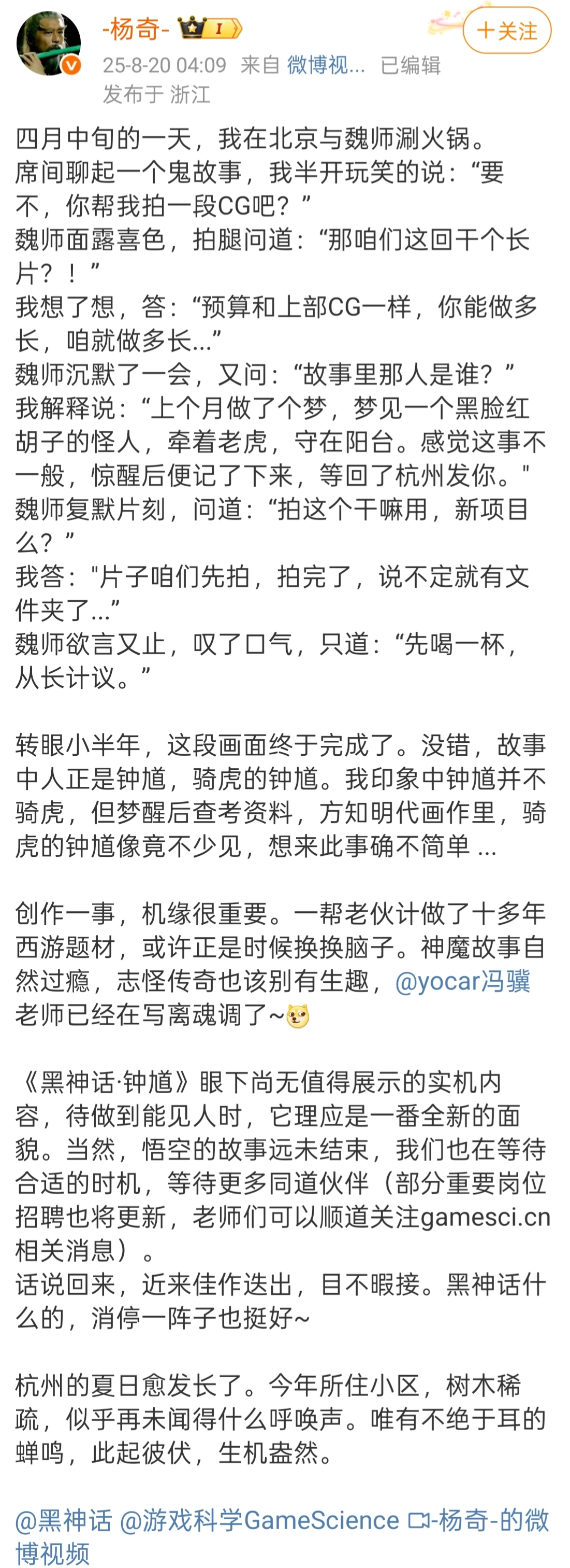 《黑神话:悟空》美术总监杨奇也在微博发长文谈《黑神话:钟馗》。杨奇表示,《黑神话:钟馗》灵感来自他做的一个梦,梦见钟馗骑虎。经过一番讨论,决定拍摄这个故事,最终创作出了《黑神话:钟馗》的先导预告。虽然钟馗骑虎并非传统形象,但他发现明代画作中确有类似描绘,认为这个故事值得尝试。