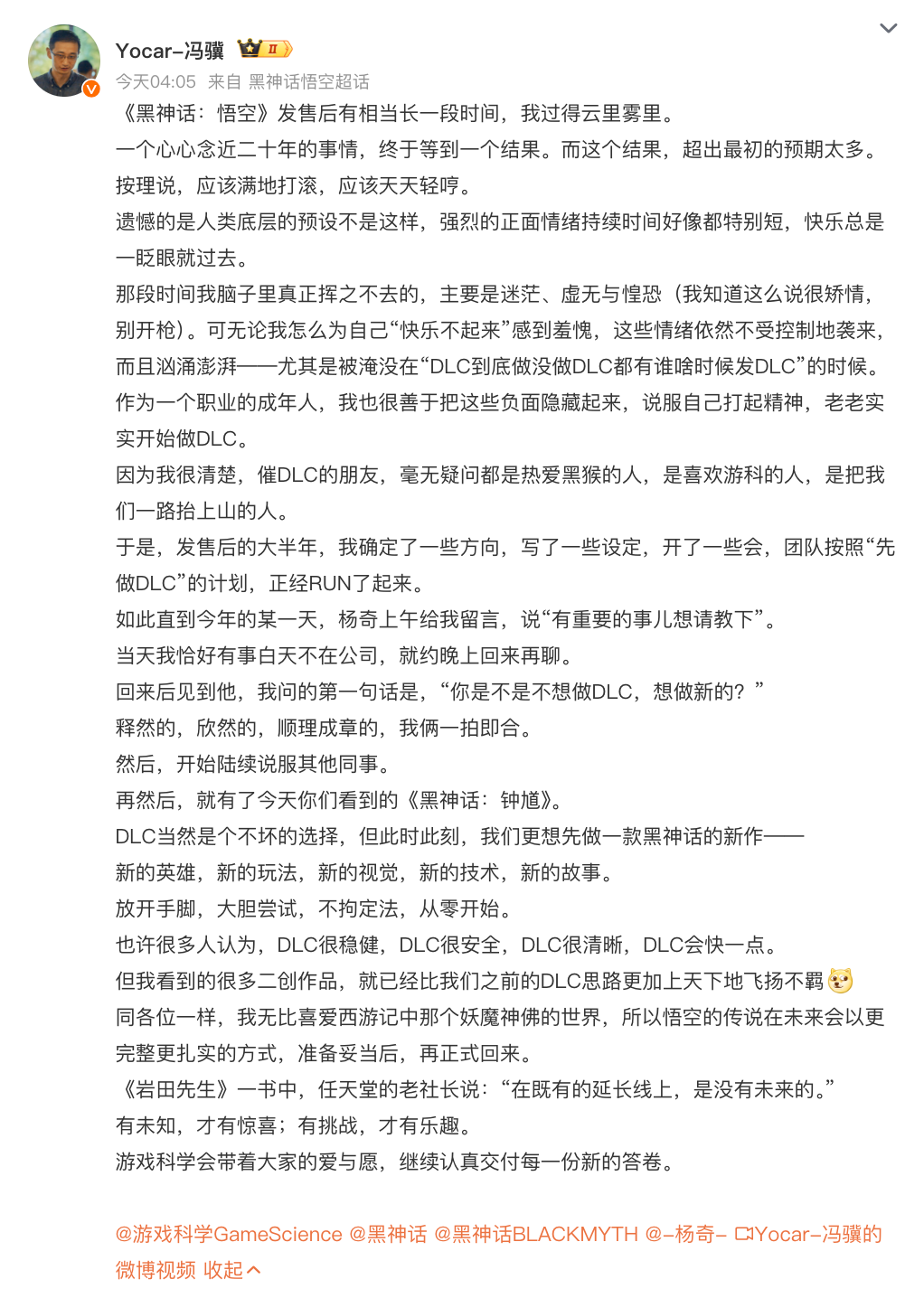 随后,游戏科学创始人、CEO,《黑神话:悟空》制作人冯骥发文解释为何推出新作。他表示,《黑神话:悟空》发售后有相当长一段时间,他过得云里雾里。DLC当然是个不坏的选择,但此时此刻,他们更想先做一款黑神话的新作——新的英雄,新的玩法,新的视觉,新的技术,新的故事。他补充说,“悟空的传说在未来会以更完整更扎实的方式,准备妥当后,再正式回来。”