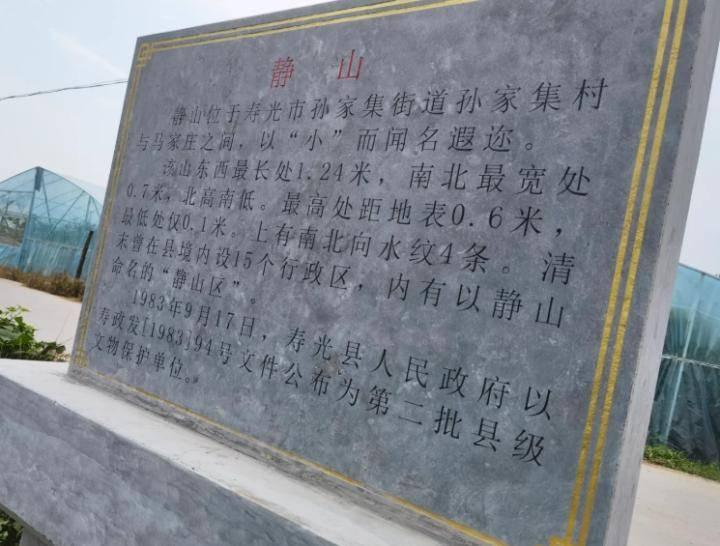 寿光当地以“寿光之最”有关于对“静山”的介绍——寿光市城西南8公里孙家集与马家庄之间,有一山石露出地面,名静山。东西最长处1.24米,南北最宽处0.7米,北高南低,最高处距地表0.6米,最低处仅0.1米。上有南北向的水纹4条,地表以下逐渐扩展庞大,莫测其深。