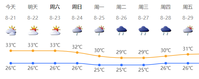 深圳今日多云间晴天,局部有短时(雷)阵雨;气温26-33℃;南风2-3级;相对湿度60%-95%。