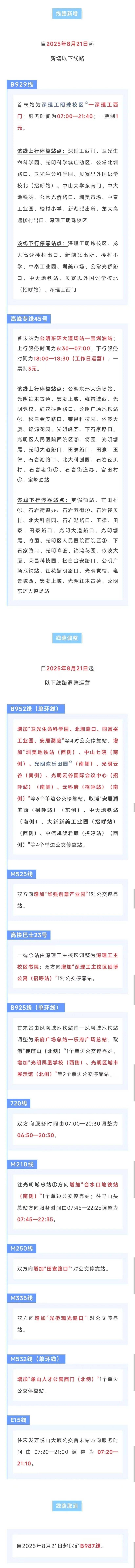● 光明:8月21日起,光明区新增、调整13条公交线路。