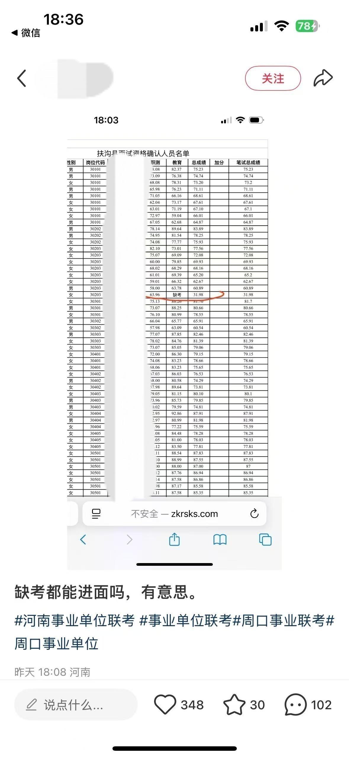 河南周口教师招聘中一考生在笔试缺考的情况下进入面试。图源:网络