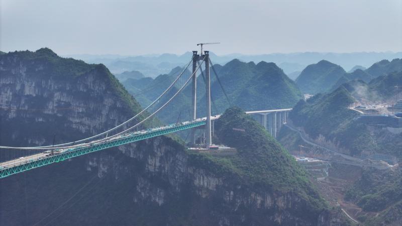 花江峡谷大桥是贵州六枝至安龙高速公路的关键控制性工程,位于关岭县与贞丰县交界处,大桥全长2890米,于2022年1月开工建设,主桥跨径1420米,桥面到水面高度625米,主桥跨径居山区桥梁跨径世界第一、桥梁高度居世界第一,被称为“横竖”都是世界第一。