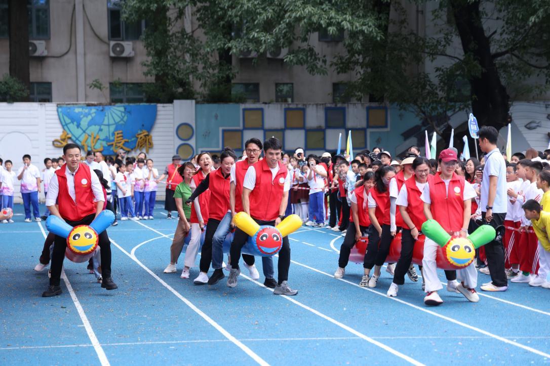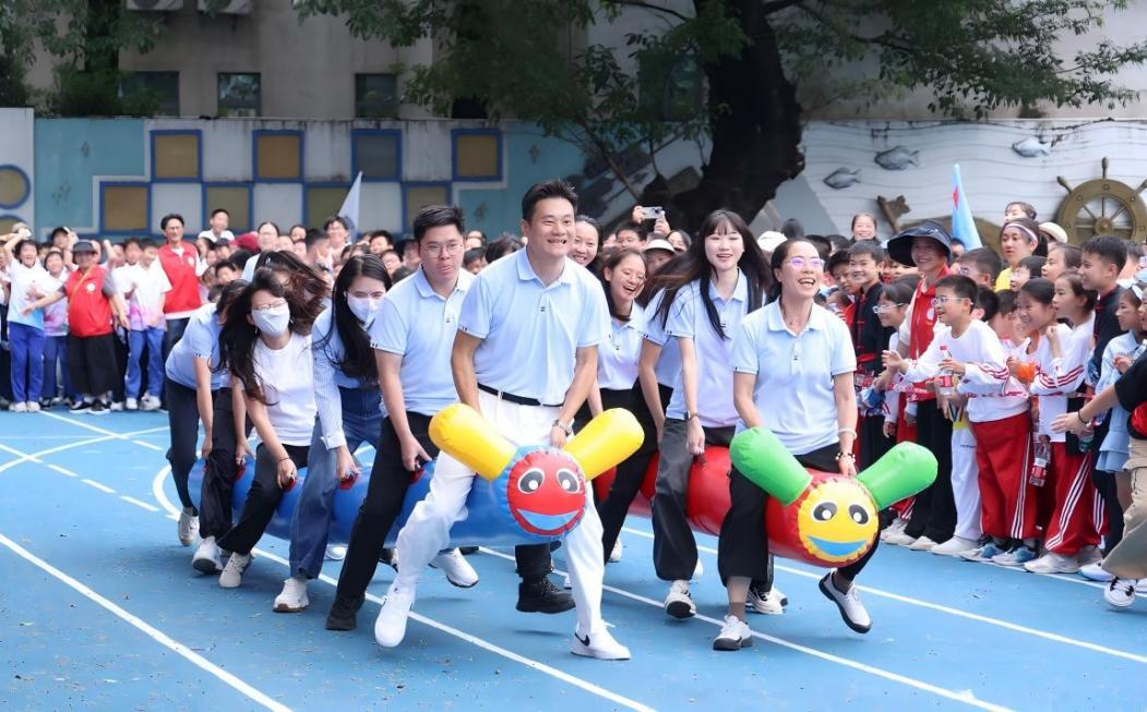 啦啦操表演结束,教职工趣味运动与家长义工趣味运动随即开启。大家合力搬运“毛毛虫”道具,奋勇争先,赛场上欢笑不断、暖意融融,一旁观战的同学们欢呼喝彩,尽享运动带来的无限乐趣。这一环节不仅丰富了运动会形式,更生动诠释了十五运 “全民全运” 的核心理念,让家校社共同沉浸在体育竞技与团结协作的欢乐氛围中。