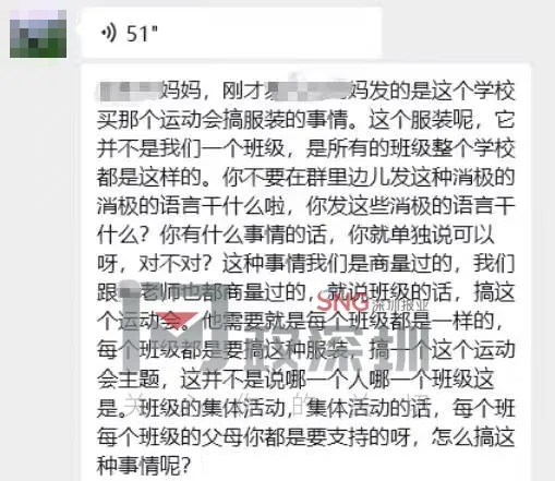 据网友反映,该校将举行运动会。家委近期在群里通知统一购买活动服装,并附带了购买链接。“这种行为不能直接叫停吗,班级里有些家长和家委故意用‘没有集体荣誉感’ ‘没有大局观’这样的言语道德绑架不想购买的家长”,该网友认为学校办运动会应回归“永不言弃的竞技精神”主旨,不应困于形式。