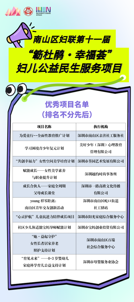 经路演评比与评审团合议南山区妇联第十一届“簕杜鹃·幸福荟”妇儿公益民生服务项目十个优秀资助项目出炉,名单公示如下。