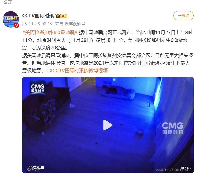 据中国地震台网正式测定,当地时间11月27日上午8时11分,北京时间今天(11月28日)凌晨1时11分,美国阿拉斯加州发生6.0级地震,震源深度70公里。