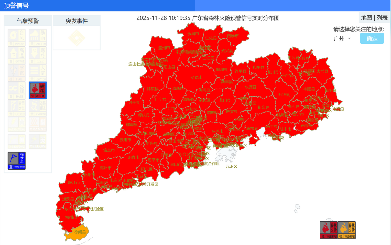 今日10时19分,广东全域森林火险预警依然生效(除徐闻县外,其余全部为红色预警)。