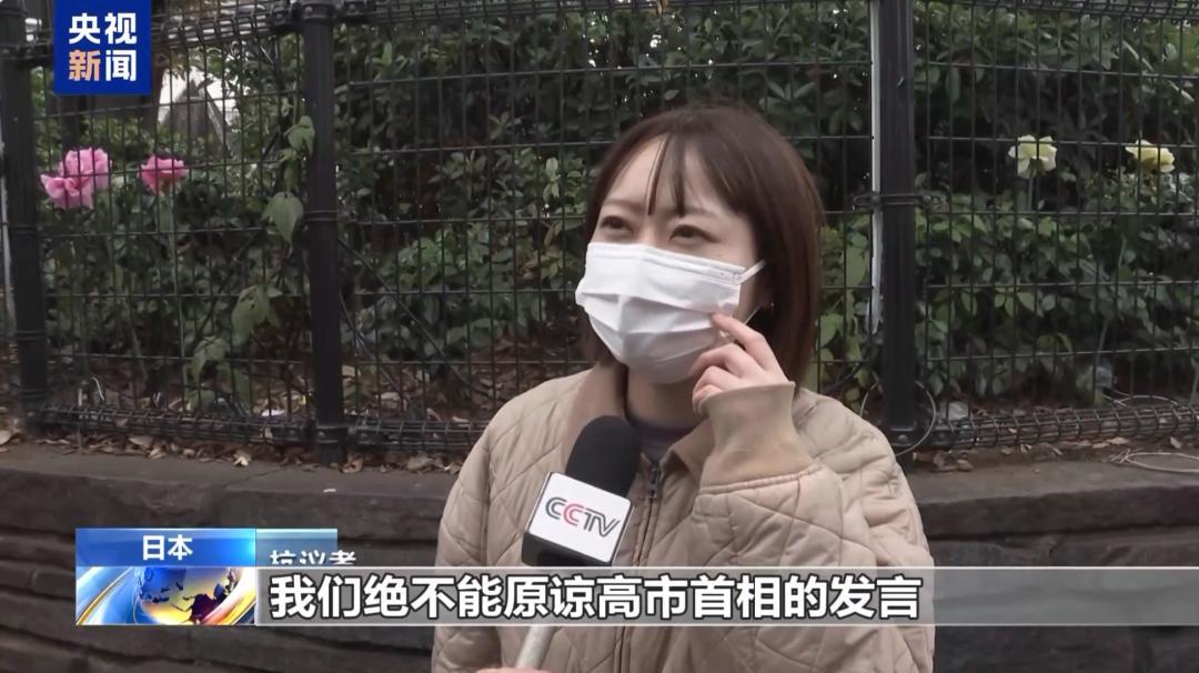 一位抗议者在现场接受央视采访时表示,“我们绝不能原谅高市首相的发言。日本首相在国会中以官方见解发表那样的言论,这不仅是高市个人的问题,我认为这是日本政府再次对中国、对亚洲发动侵略战争的宣言。”