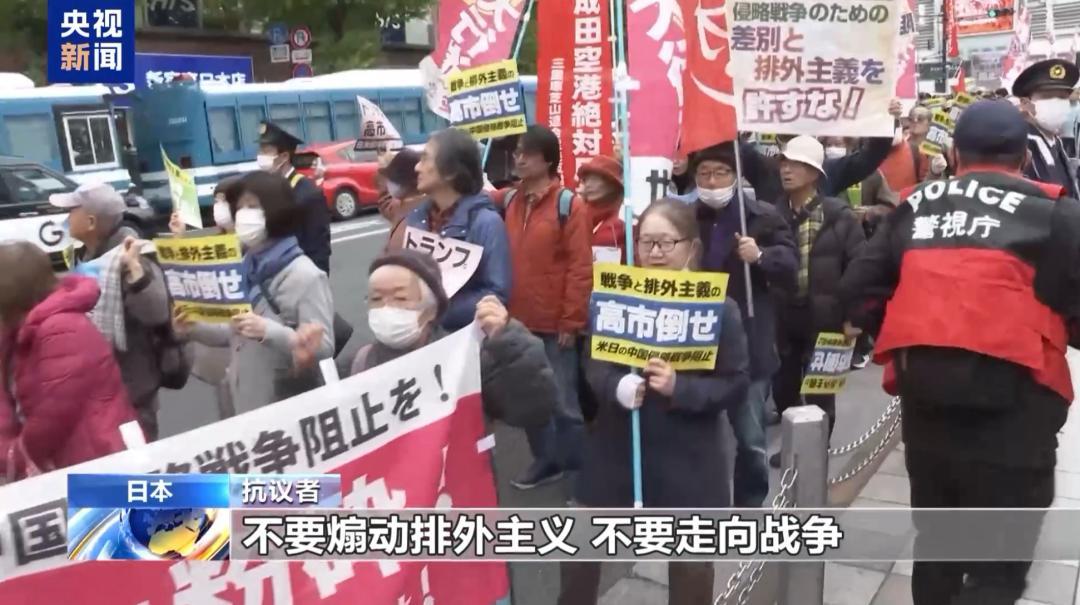 抗议者现场高呼:反对战争,打倒高市。粉碎日美安保体制,美军基地搬出日本。弹劾高市关于“台湾有事”的言论,绝不允许“存立危机事态”的说法。不要煽动排外主义,不要走向战争。