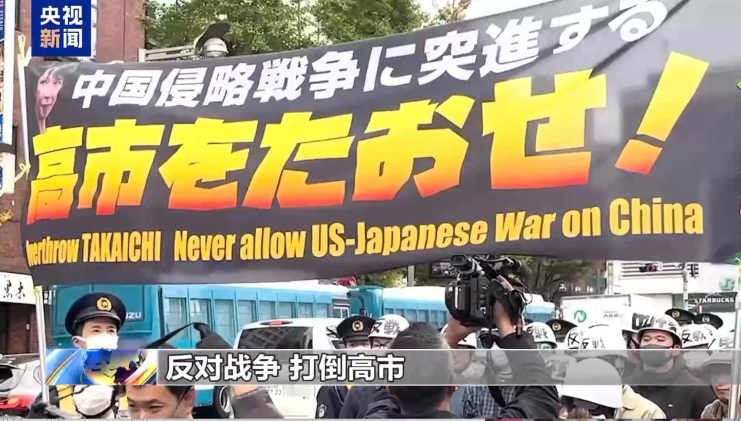 记者在现场看到,日本民众举着“打倒高市”“阻止美日对中国发动侵略战争”等标语,要求日本首相高市早苗撤回涉台错误言论。