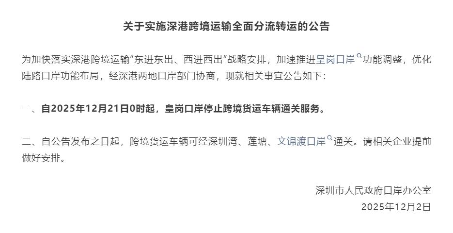 公告中提到,为加快落实深港跨境运输“东进东出、西进西出”战略安排,加速推进皇岗口岸功能调整,优化陆路口岸功能布局,经深港两地口岸部门协商,自2025年12月21日0时起,皇岗口岸停止跨境货运车辆通关服务。自公告发布之日起,跨境货运车辆可经深圳湾、莲塘、文锦渡口岸通关。