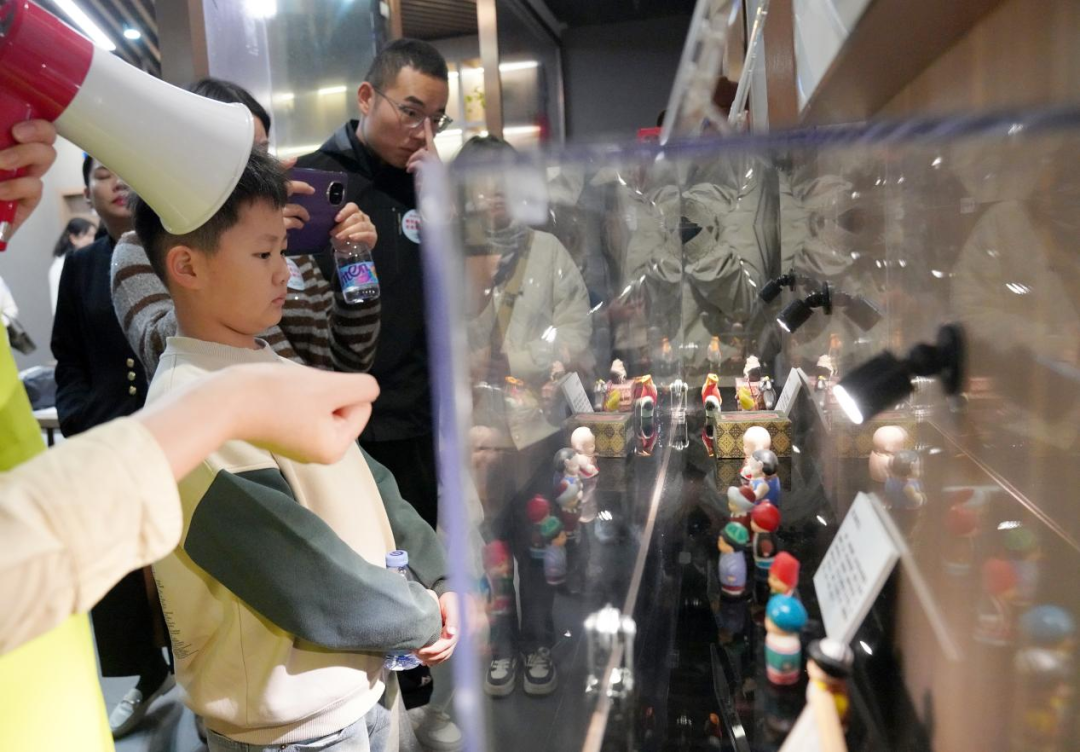 南园街道非遗主题图书馆里陈列的非遗手工艺品。