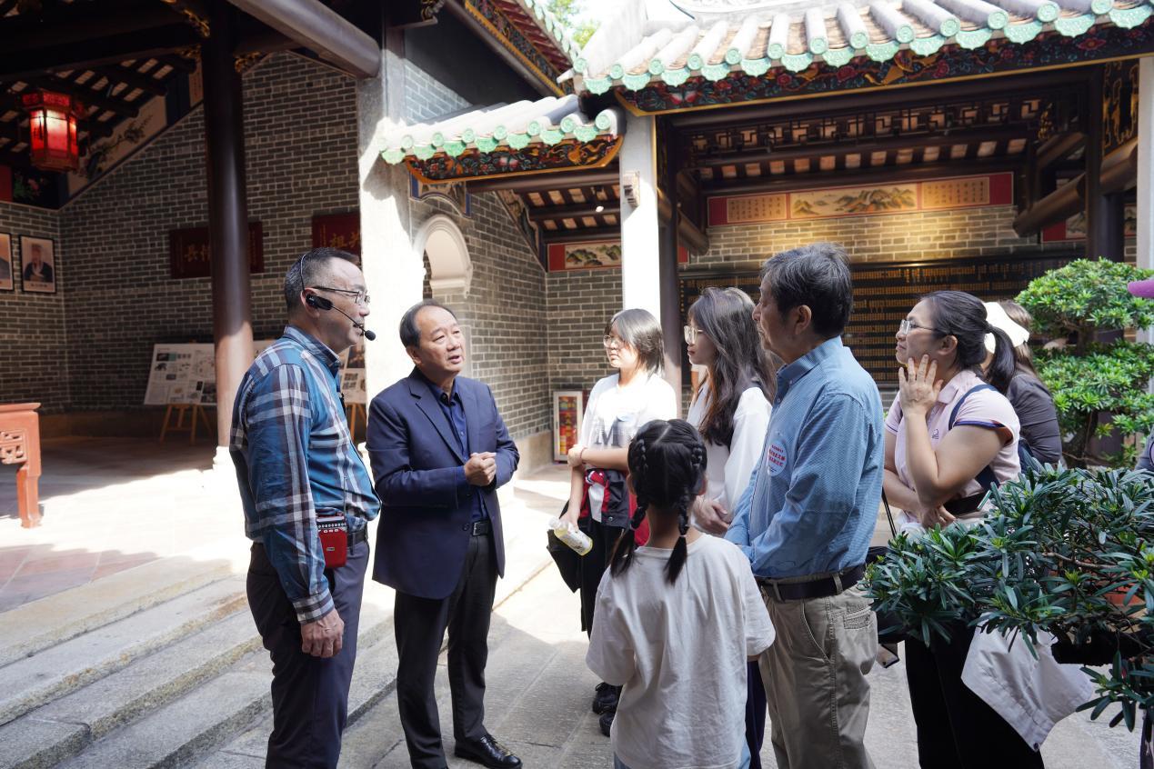 湖贝实业股份有限公司老董事长张齐心(图左二) 为大家介绍湖贝怀月张公祠堂。