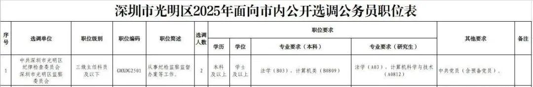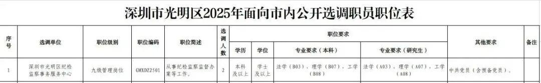 深圳新闻网2025年12月5日讯(记者 关嘉晖)为进一步优化队伍结构,吸引、锻造一支堪当科学城建设重任的高素质干部队伍,推动光明科学城更高水平、更高质量发展,光明区纪委监委现面向全市公开选调2名公务员、2名职员。