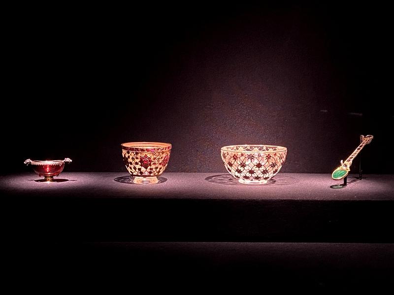 鎏金银镶边石榴石杯、镶宝石水晶杯(2个)、镶钻祖母绿金勺。(记者 童小晋摄)