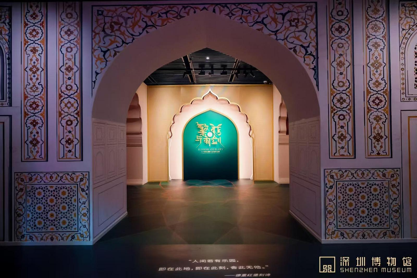 为了让观众深度沉浸莫卧儿文明,展览在设计上暗藏巧思:展区以“权力”与“艺术”为主线、“昆丹工艺”为隐线,“艺术”展区采用多边形几何切割造型,呼应莫卧儿时期经典对称元素;大面积红绿对比色构建充满张力的叙事空间,搭配低反射玻璃与定制色温的专业珠宝灯光,让珍宝细节清晰呈现;设置展品衍生光影艺术装置“繁花秘境”和沉浸式光影艺术装置“泰姬陵·浮光幻彩”,为观众带来极致视觉体验。深圳博物馆还联合深圳职业技术大学为展览配套安排“匠心对话:莫卧儿美学遇上设计之都深圳”区域,探索莫卧儿艺术与现代城市创意设计的共鸣。