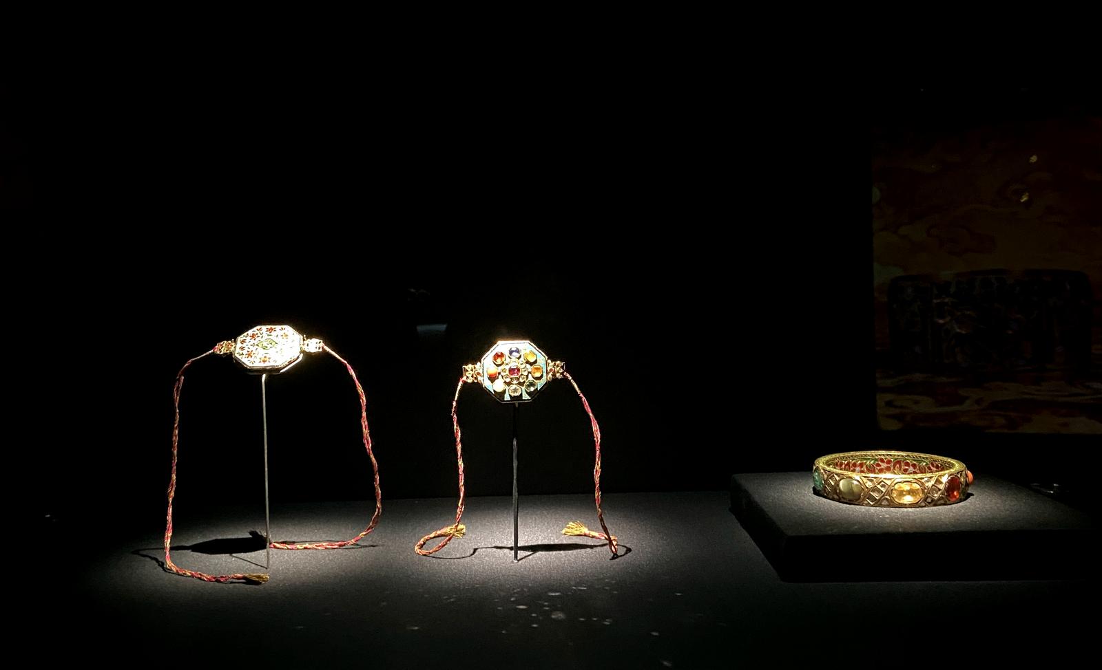 镶九宝臂章(2个)、镶九宝手镯。(记者 童小晋摄)