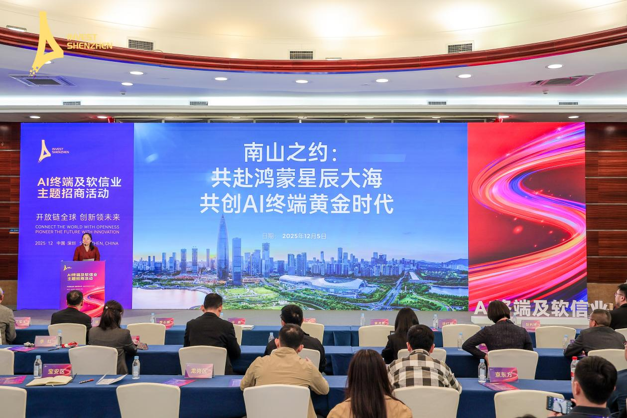 在AI终端及软信业主题招商活动上,南山区工业和信息化局三级调研员李红重点推介了鸿蒙生态与AI终端产业的战略布局。她表示,南山凭借雄厚的产业基础与前瞻性布局,已在鸿蒙生态建设中形成显著先发优势,不仅建成全国首个鸿蒙生态创新中心,更系统推动原生应用开发与场景落地。当前,南山正着力构建“RISC-V芯片、鸿蒙系统、AI终端”的协同创新体系,并配套推出“鸿蒙8条”专项政策,通过资金支持、场景开放等机制,全力赋能企业技术落地与产品创新。