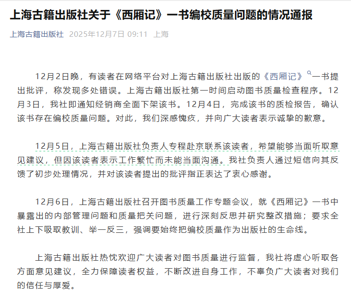 ●上海古籍出版社通报《西厢记》存多处错误:深感愧疚,下架整改。