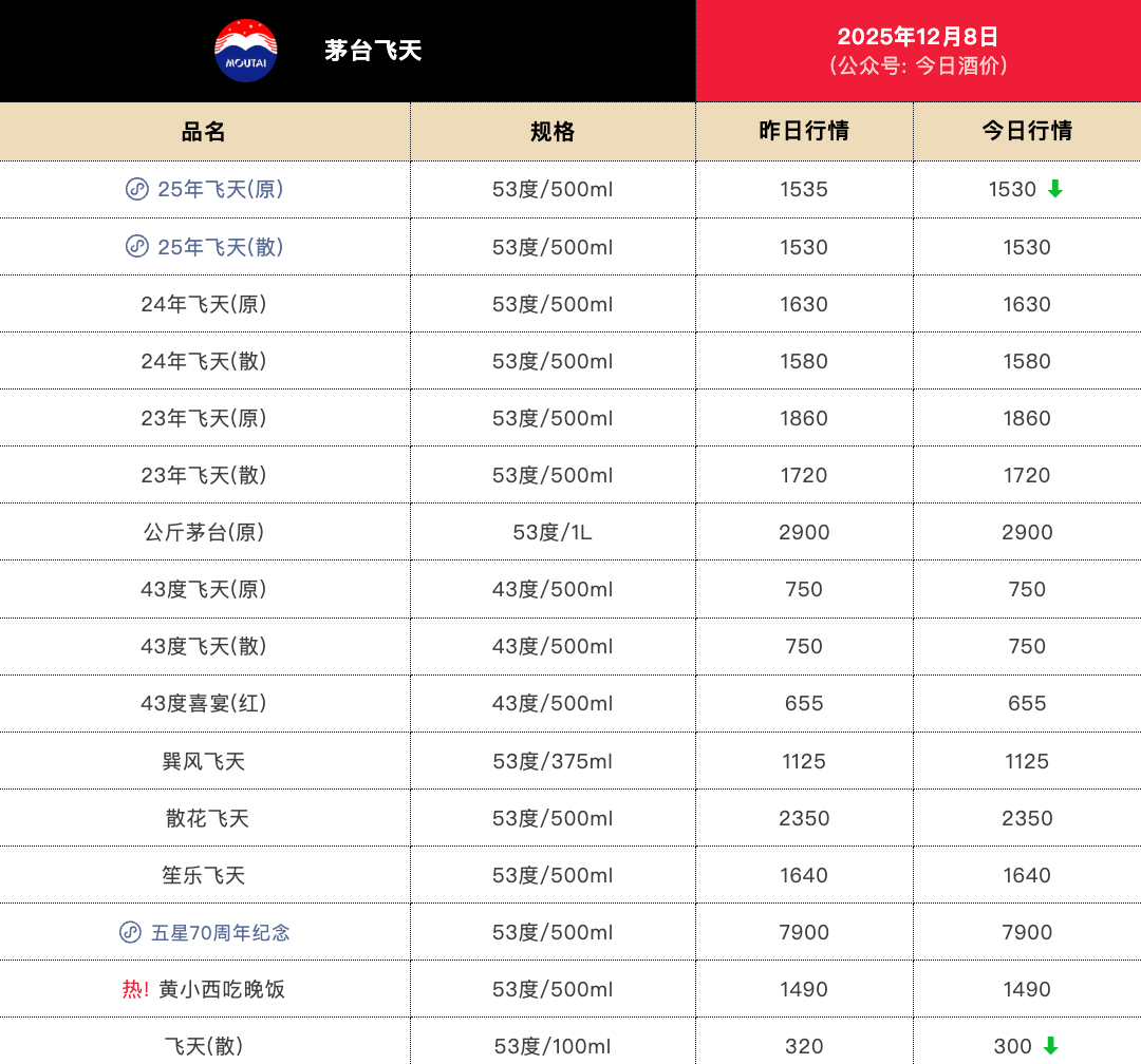 ● 12月8日,25年飞天茅台原箱较前一日下跌5元,报1530元/瓶。