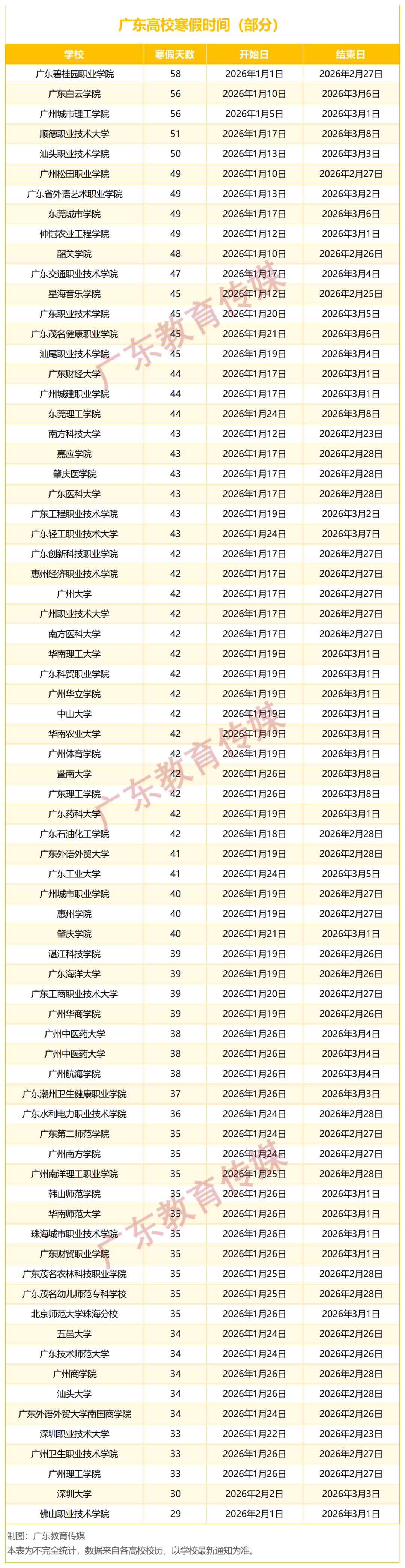 ● 广东大中小学寒假时间表出炉,据不完全统计,广东今年最晚放假的高校是深圳大学。