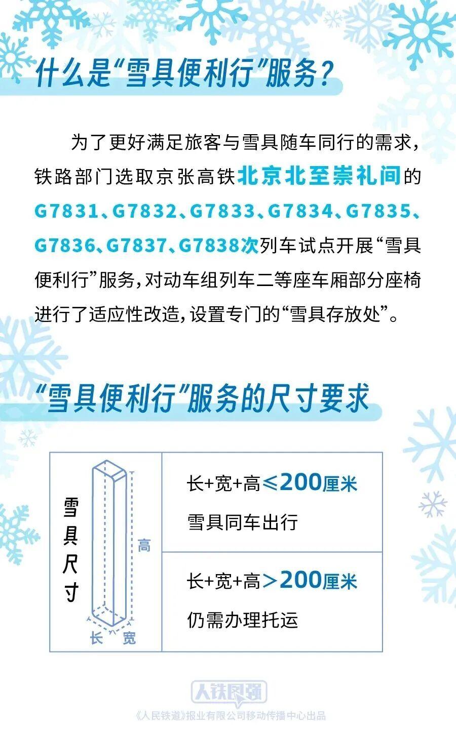 ● 12月7日起至2026年雪季结束,铁路部门在京张高铁北京北至崇礼间各车站运行的G字头列车试点推出“雪具便利行”服务。