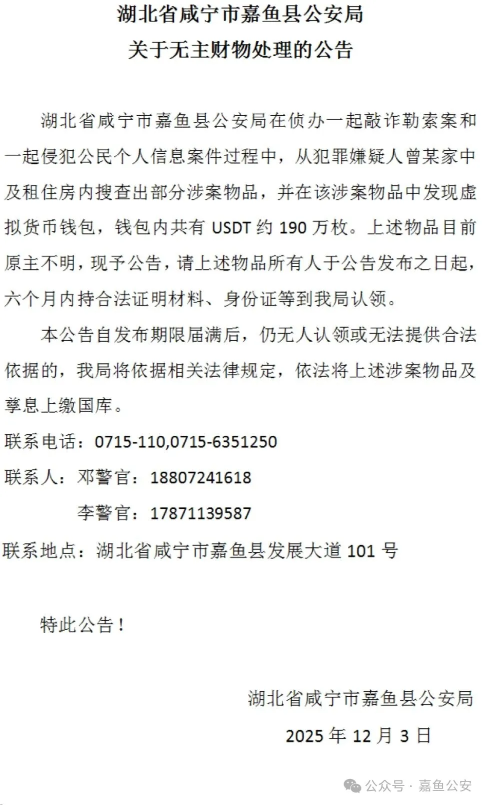 ●湖北嘉鱼县公安局发公告寻找190万枚USDT持有人,价值1300余万元,警方回应:以公告为准。