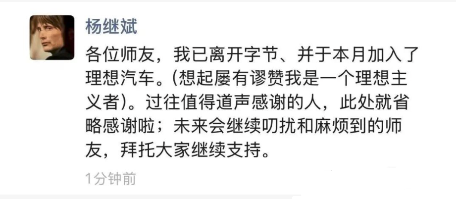 ● 前字节跳动公关总监杨继斌官宣:已加入理想汽车。