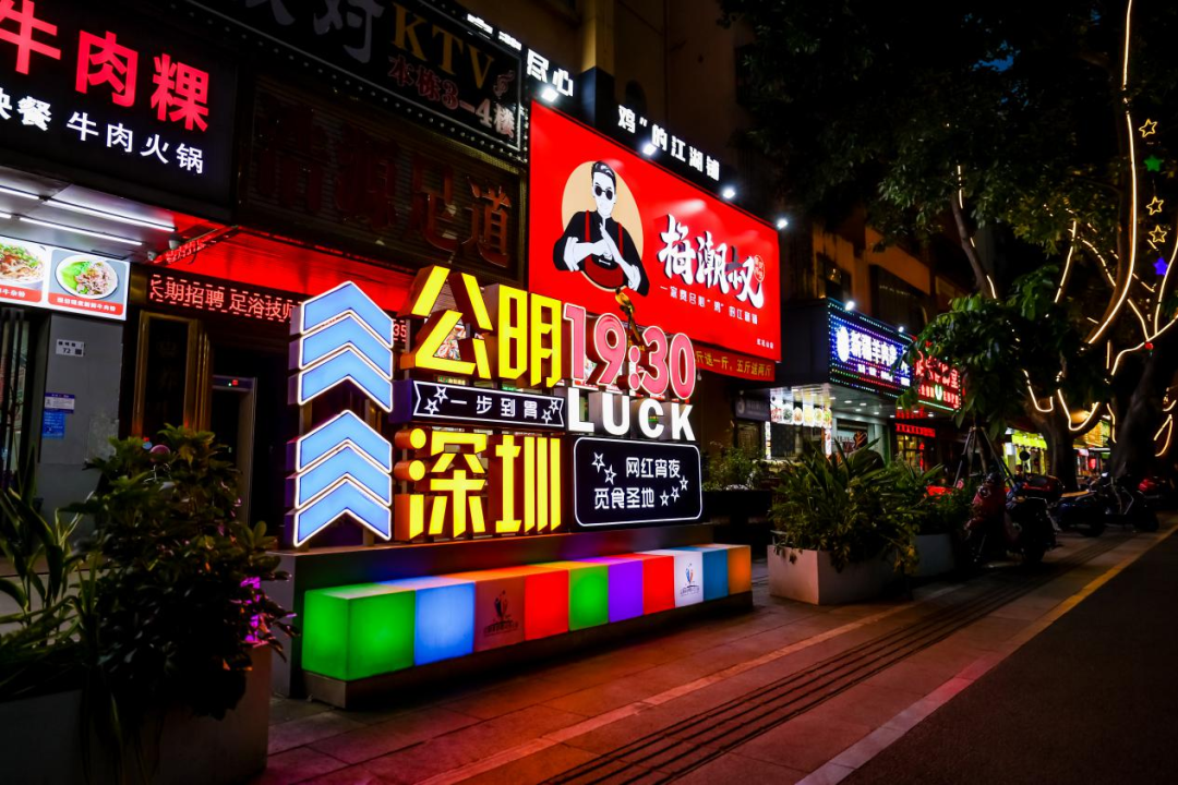 而真正汇聚烟火气的,是公明街道精心打造的夜色烟火步行街。华灯初上,外摆区花箱装点、灯光温馨,烧鹅濑粉、手作小吃、文创小摊渐次展开,成为从“逛公园”到“品美食”的一站式体验区,也成为“公园+商业”联动共赢的美好写照。