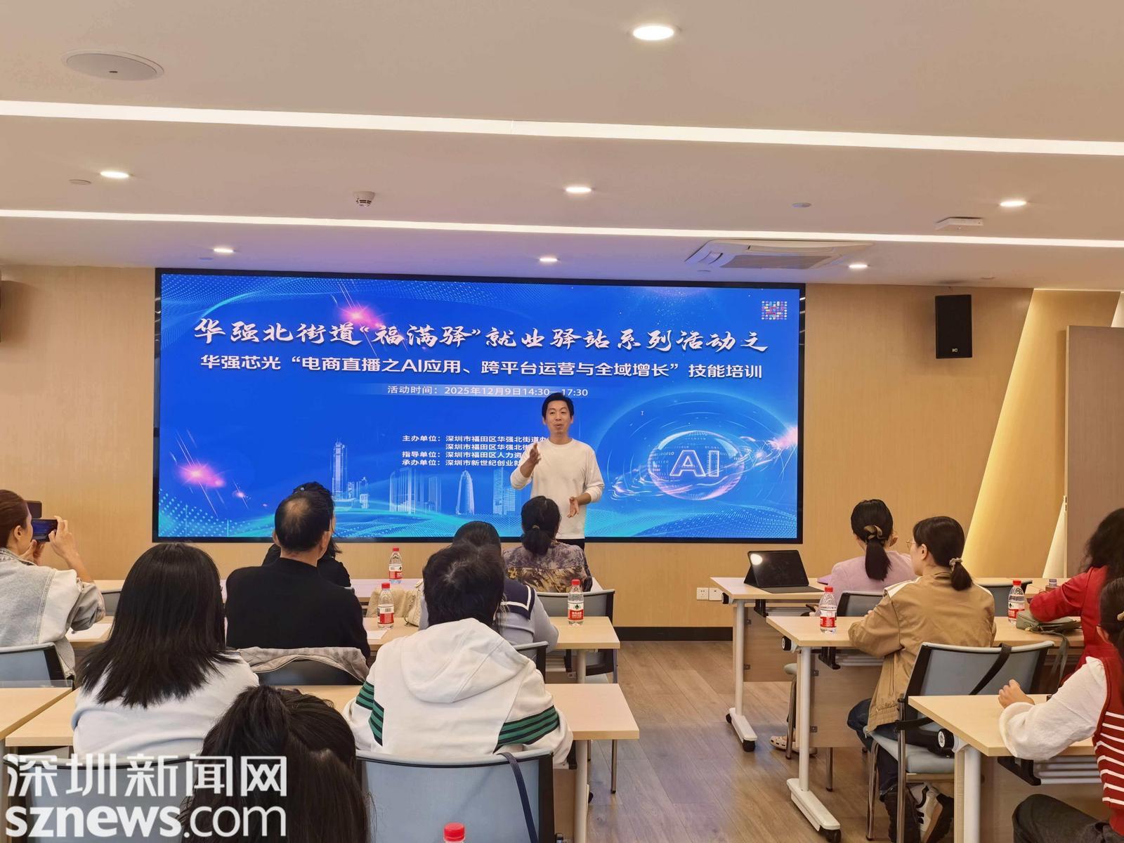 深圳新闻网2025年12月10日讯(记者 杨铭琪 通讯员 李强 张炀)12月9日下午,华强北街道“福满驿”就业驿站在中电迪富大厦举办“华强芯光——电商直播之AI应用、跨平台运营与全域增长”技能培训活动,吸引近40名辖区求职者、创业者、电商从业者参与,现场学习氛围浓厚。