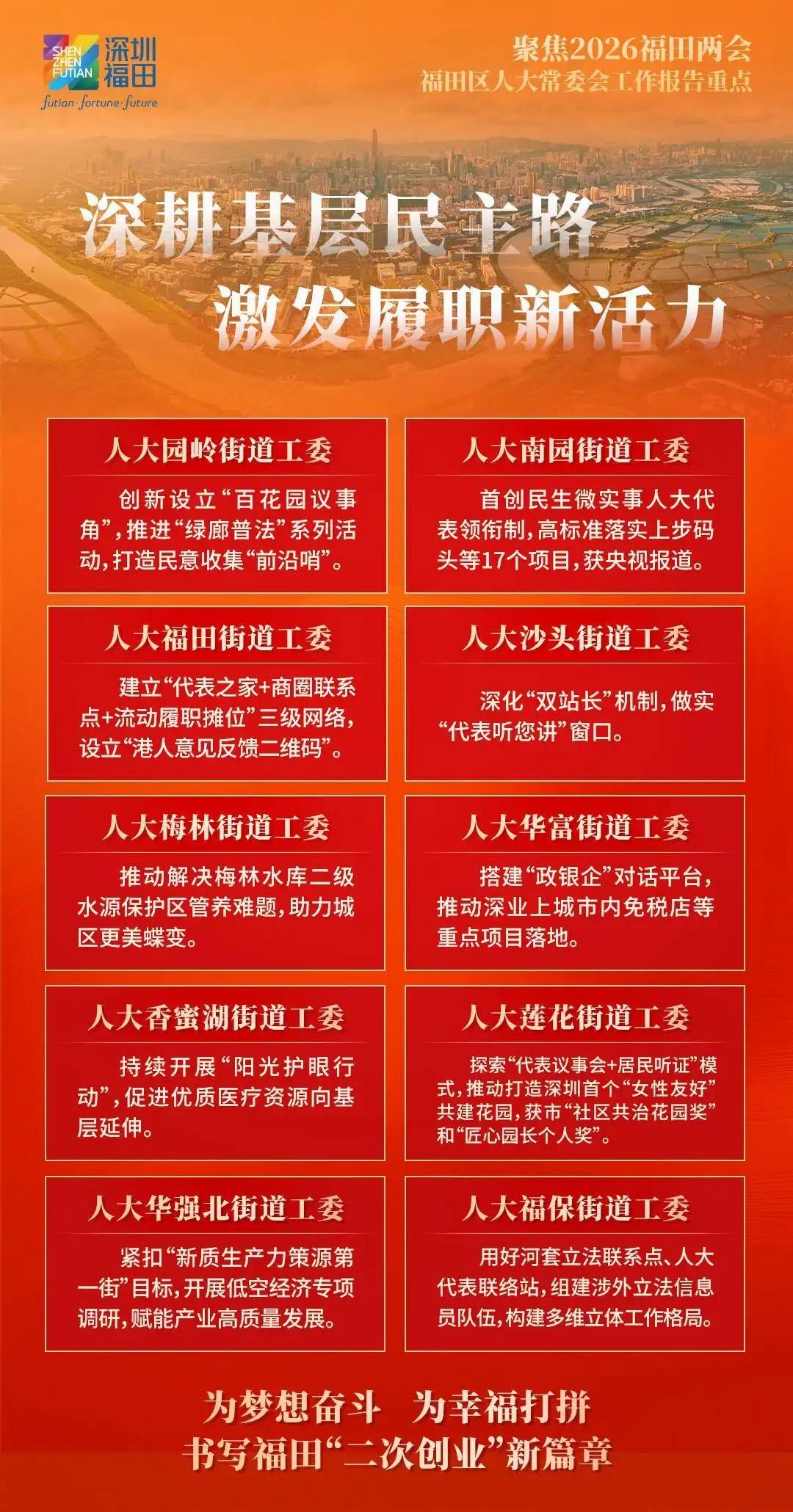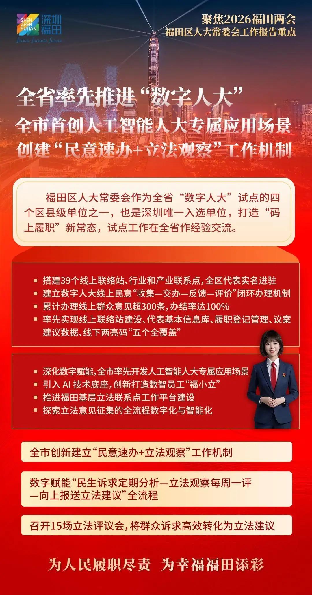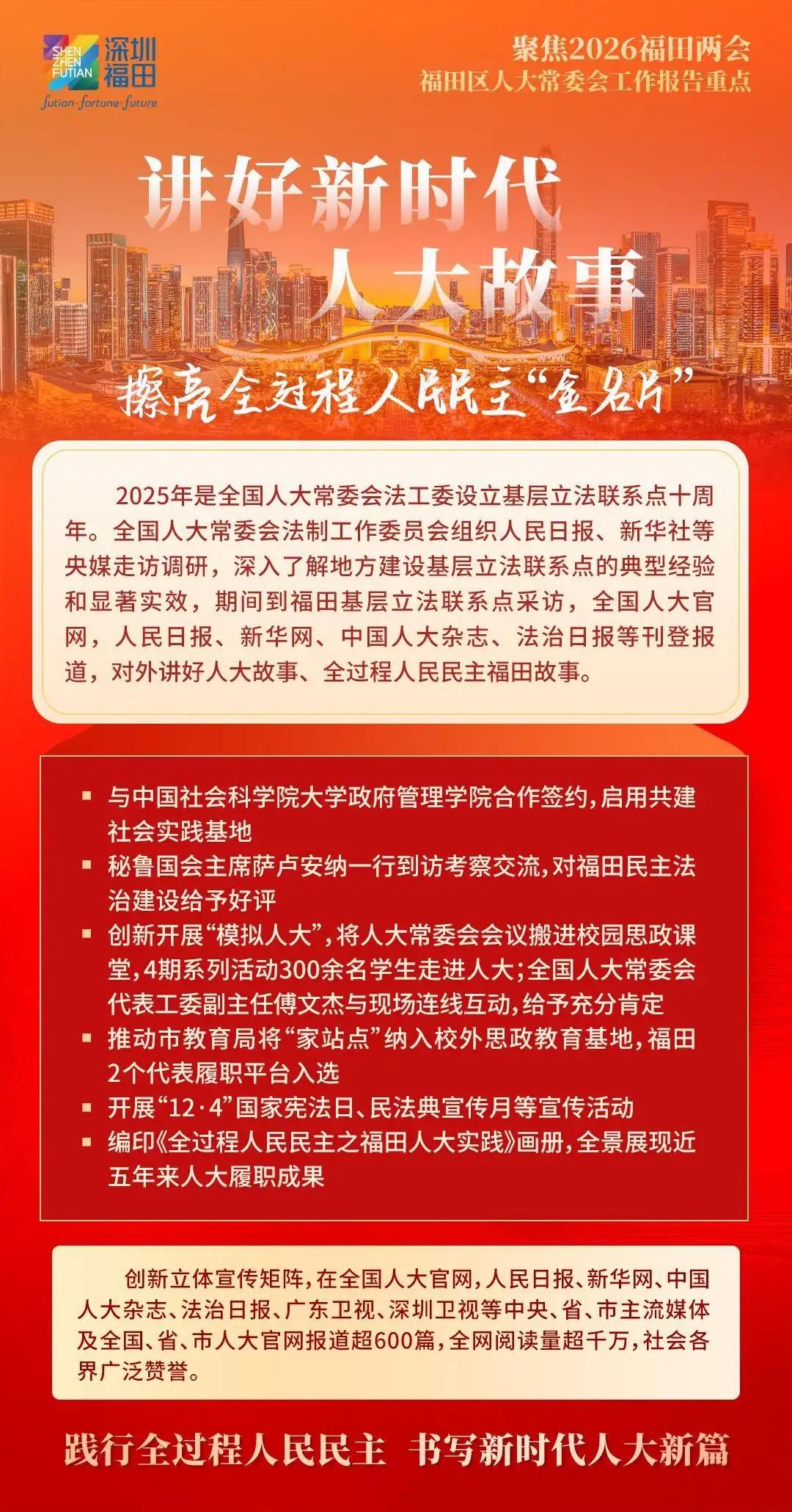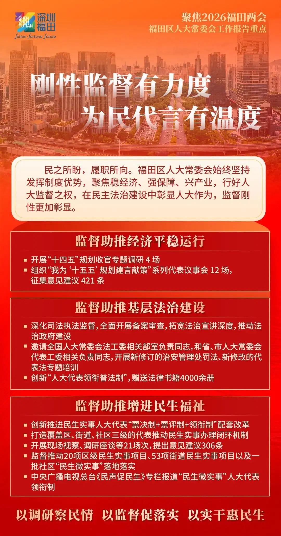 福田区人大常委会将向“新”而行,发挥国家级基层立法联系点作为粤港澳大湾区“立法前哨”的优势作用,积极向上反映民智民意,为福田改革发展争取更多立法和政策支持;向“新”图强,探索行业产业联系点“链”上履职新机制,赋能福田经济社会高质量发展,以奋进姿态走好“十五五”新征程;向“新”聚力,充分发挥人大在密切同人民群众联系中的带头作用,汇集一切资源、力量、智慧,为福田勇担中心城区使命任务厚植民主法治沃土,奋力实现“十五五”良好开局,书写福田“二次创业”新篇章,为深圳加快打造更具全球影响力的经济中心城市和现代化国际大都市作出新的更大贡献。