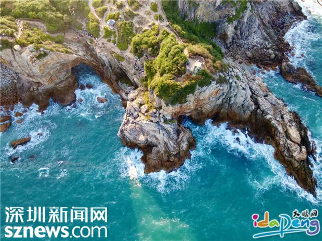 鹿嘴景区集山海风光、户外徒步、网红打卡于一体,是东山片区文旅资源的核心代表。景区内的人鱼洞为天然海蚀洞穴,因电影《美人鱼》取景而闻名,洞体与澄澈海水相映成趣,成为标志性打卡地标;全长近5公里的鹿嘴碧道依山傍海,海堤步道分上下两层,下层为徒步亲水步道,可沿途赏景、近距离感受海风;上层为观光道,乘观光车穿行时能大广角把海湾盛景收入眼帘。鹿雁科考线串联鹿嘴山庄与大雁顶,登顶后可将大亚湾全景尽收眼底,成为户外爱好者的优选路线。此外,碧道沿线多个网红打卡点,为游客提供了丰富的摄影创作场景。